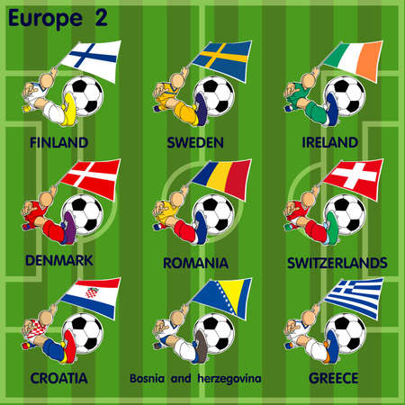 ベクトル漫画のフィンランド スウェーデン アイルランド デンマーク ルーマニア スイス クロアチア ボスニア ヘルツェゴビナ Greecel フィールドを含むヨーロッパからの 9 つのサッカー サッカー チームの のイラスト素材 ベクタ Image