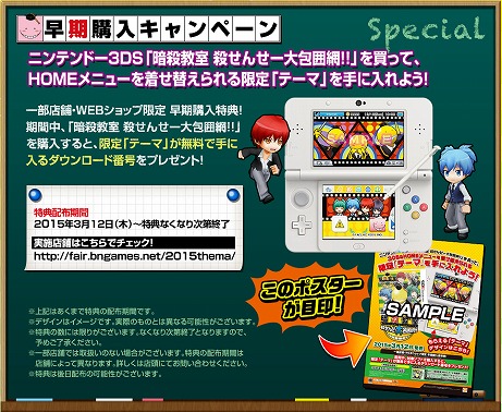 暗殺教室 殺せんせー大包囲網 店舗別特典の 着せ替えアイテム やオリジナルグッズが公開 早期購入でオリジナル3ds用 テーマ がもらえる